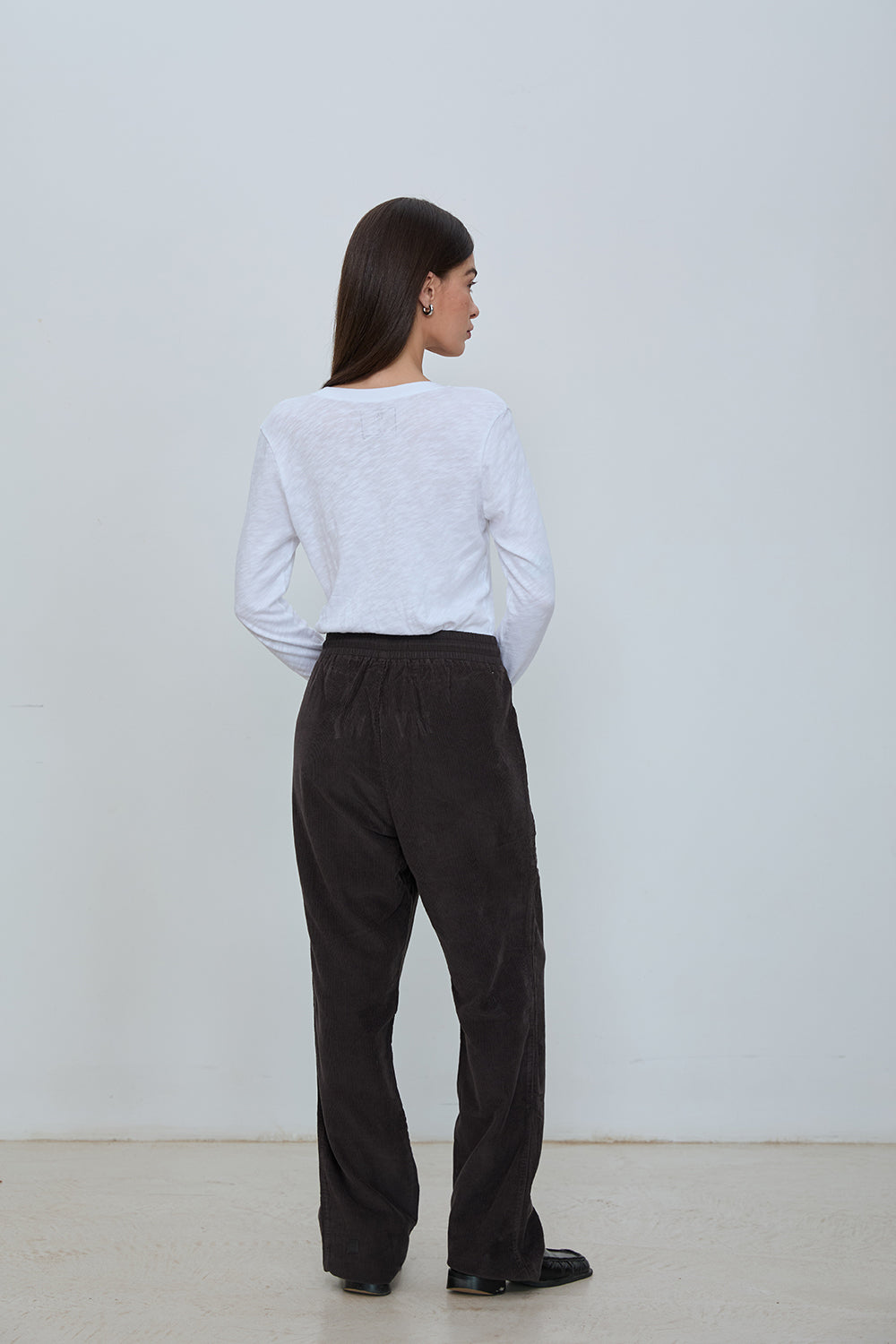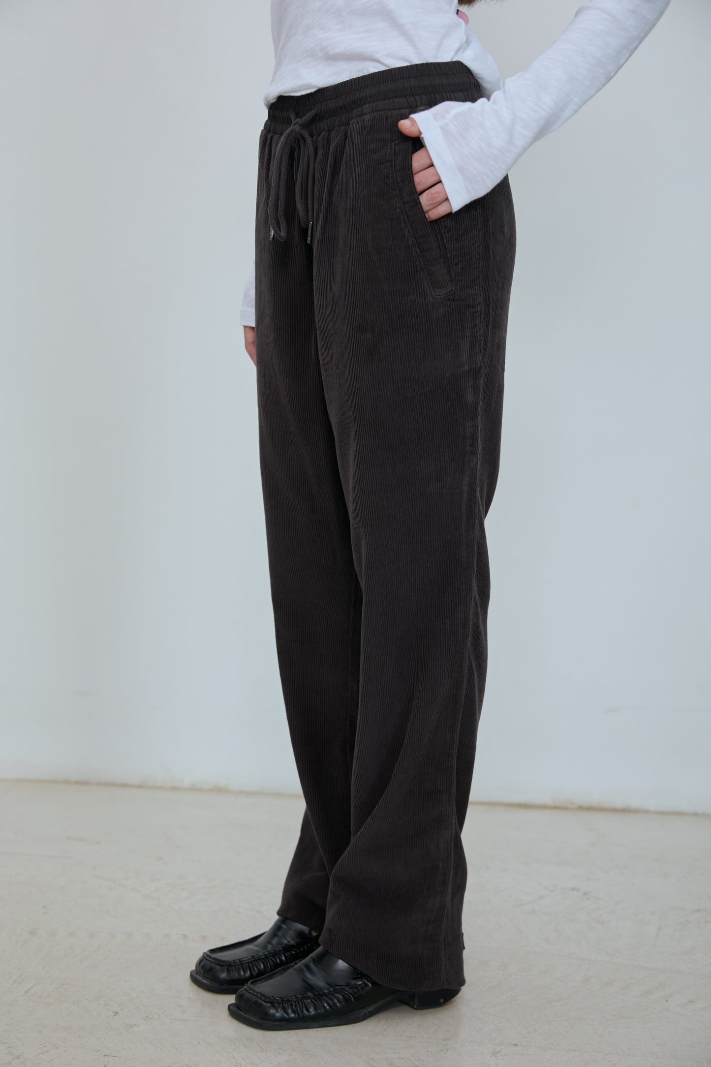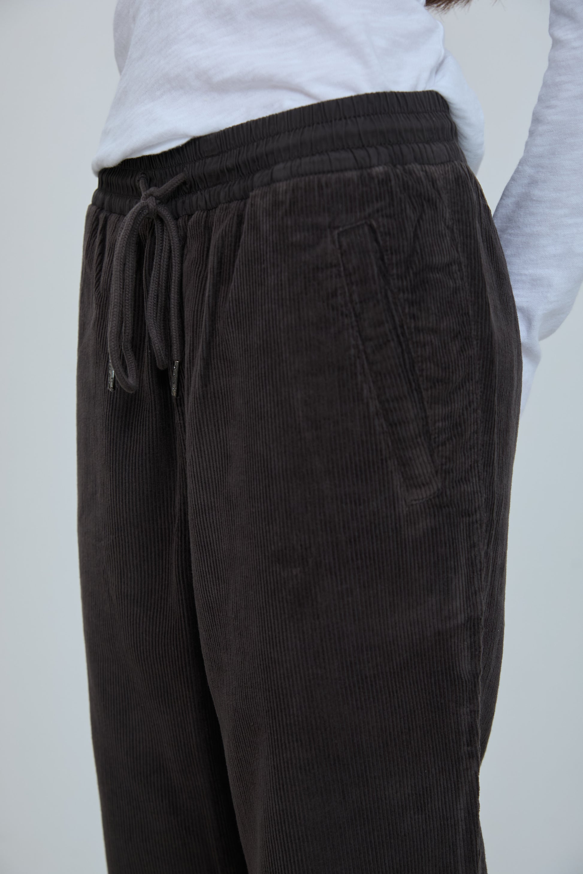 Mid rise corduroy pant in soft cotton corduroy. Elastic waistband with long drawstrings. Straight side pockets and a straight leg with a subtle wide fall. Pull on construction with no zipper or button.