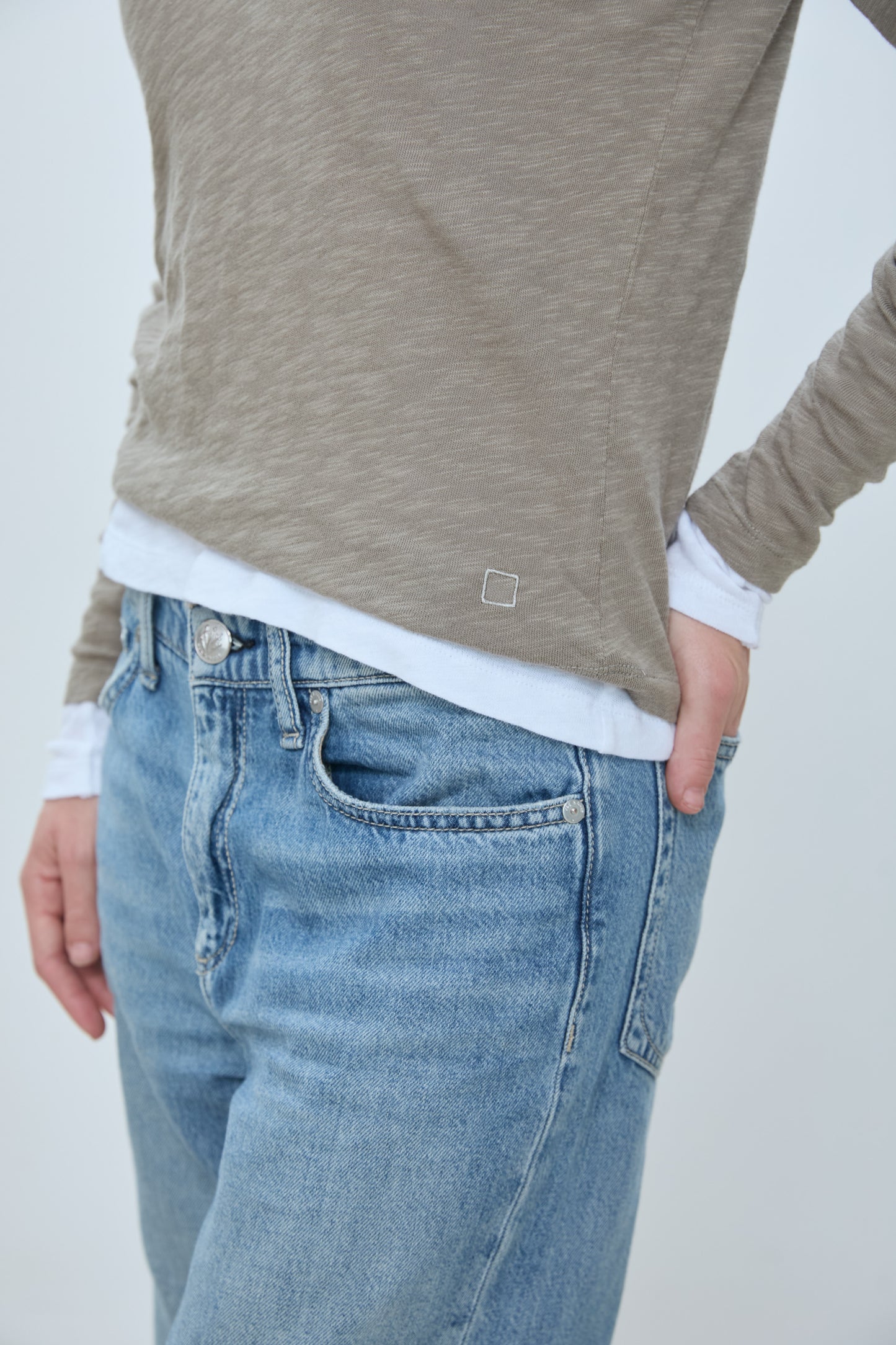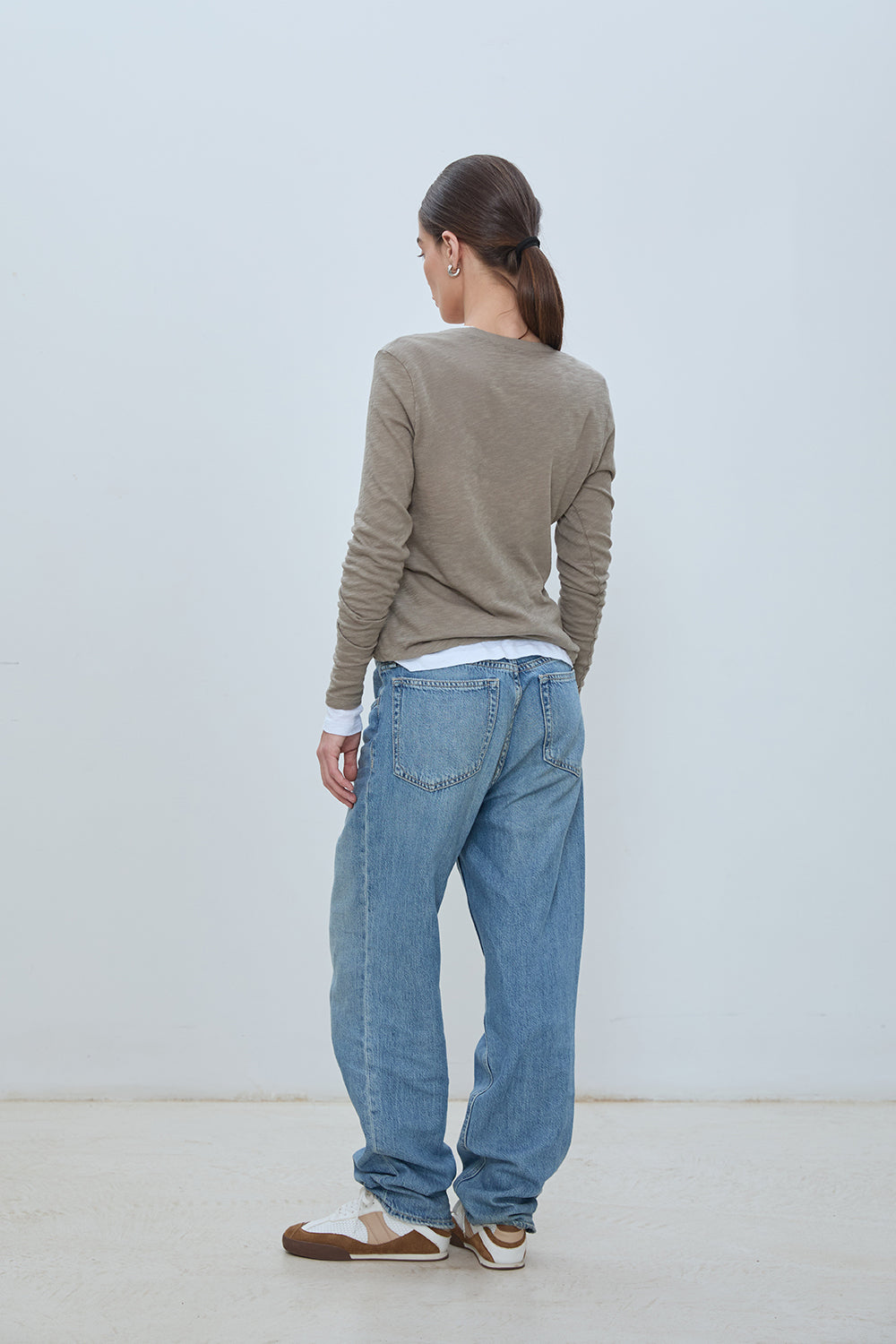 Long sleeve V neck tee in soft cotton jersey. Lightweight feel with a natural slub texture, finished with a clean neckline trim and straight hem. Designed for an easy, everyday fit.