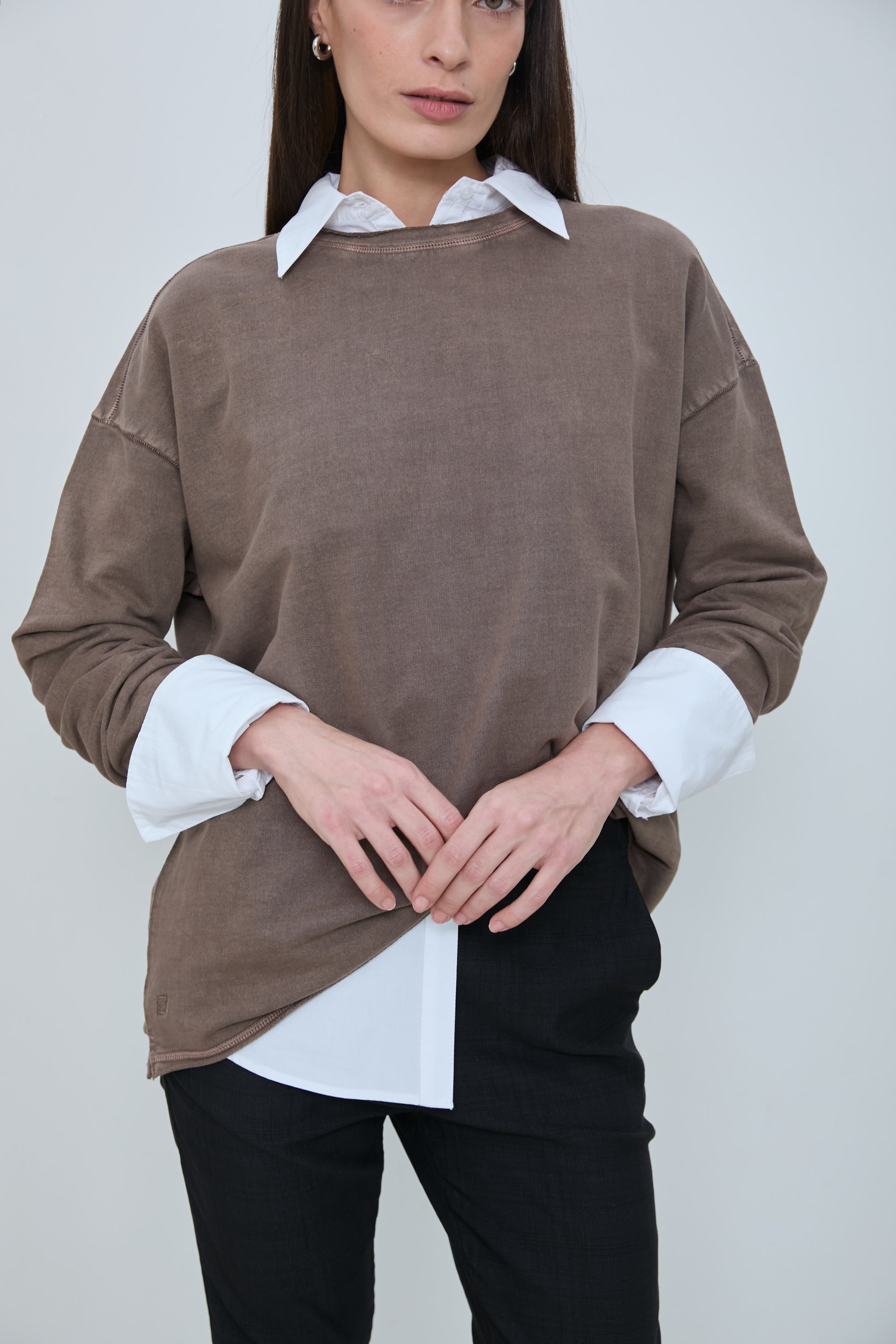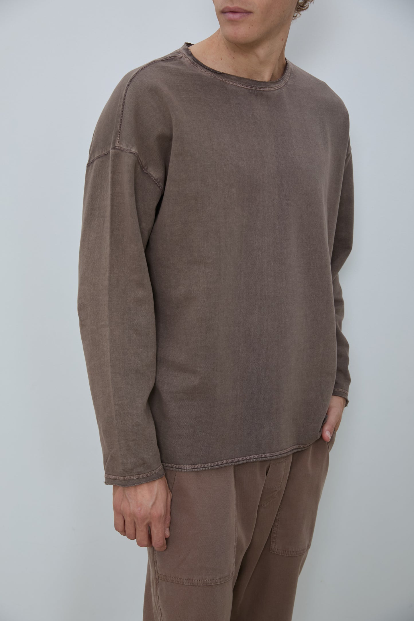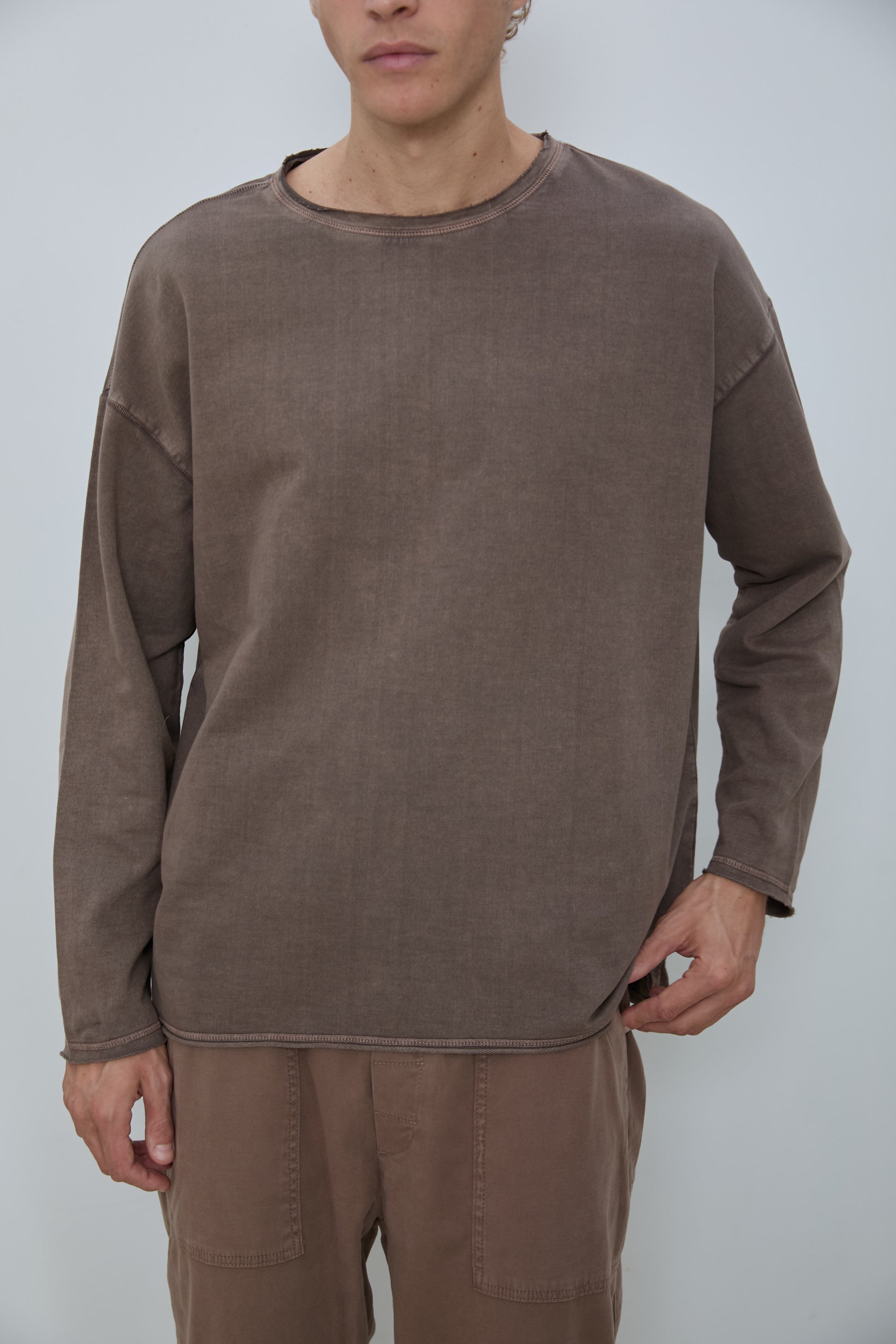Relaxed crewneck sweatshirt in classic French terry. Soft loopback interior with a natural, lived in texture, finished with raw edge neckline detailing, dropped shoulders, and a straight hem. Designed for an easy, effortless fit.