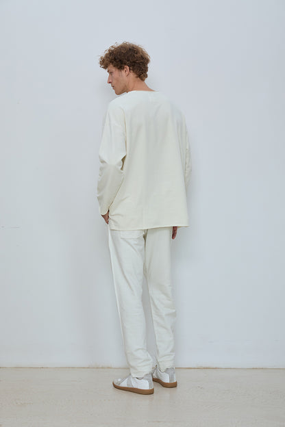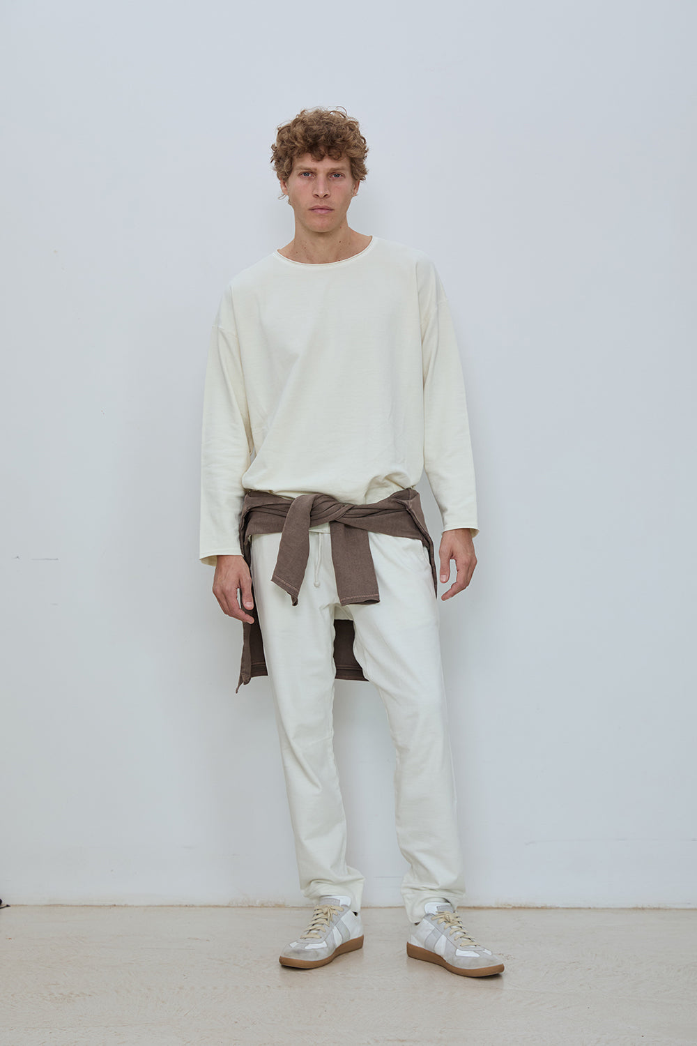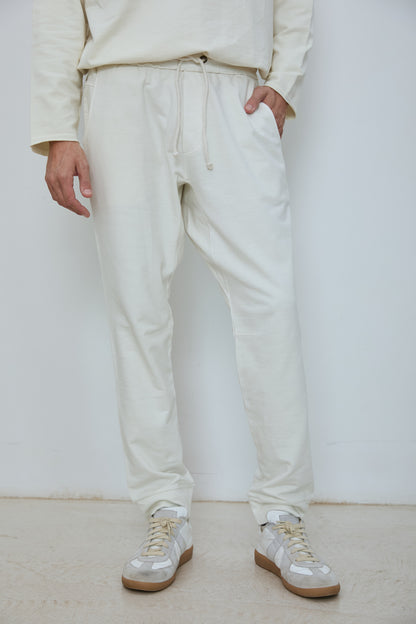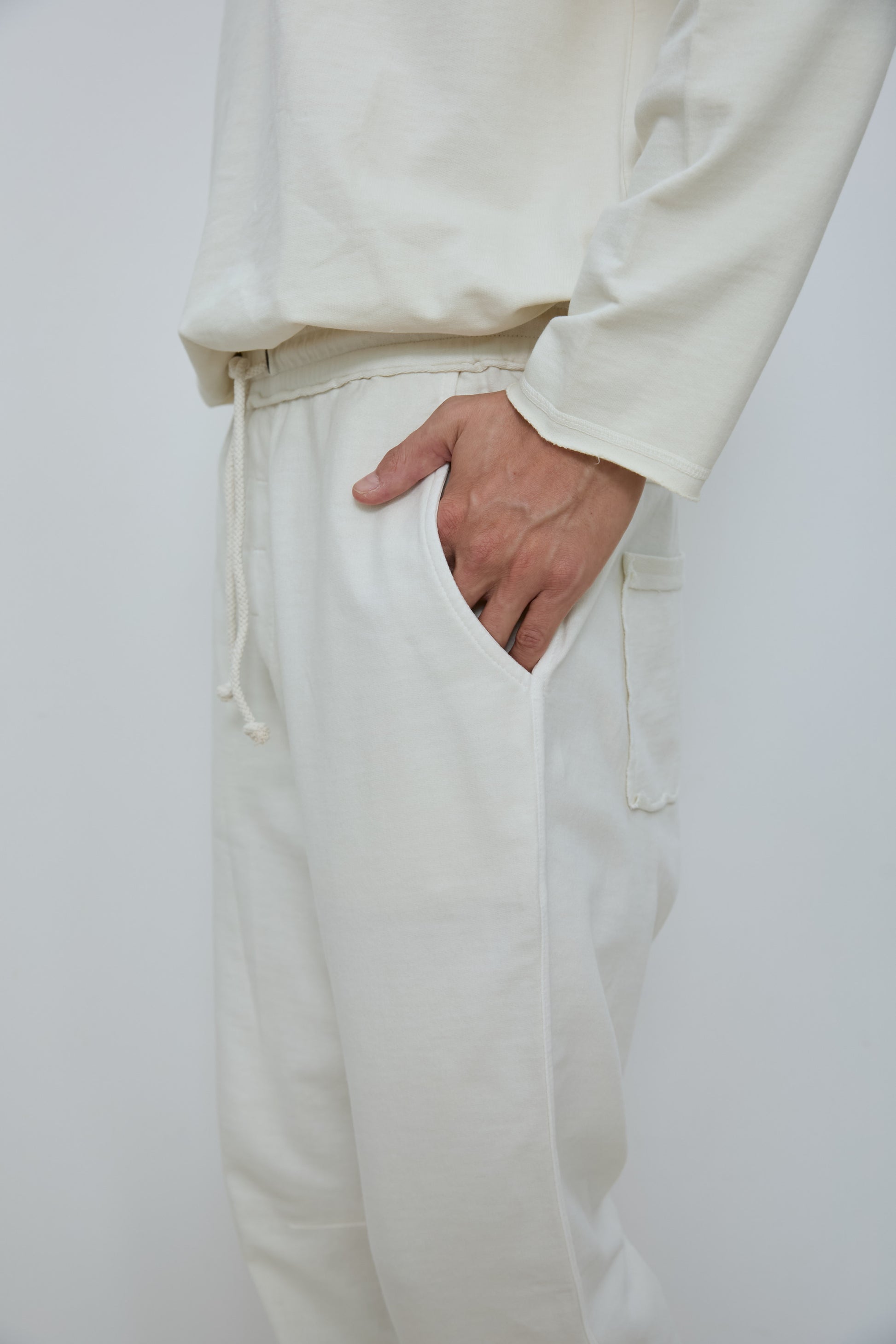 Mid rise sweatpant in classic French terry. Elastic waistband with long braided drawstrings, straight side pockets, and a tapered leg with a soft, relaxed finish. Pull on construction with no zipper or button.